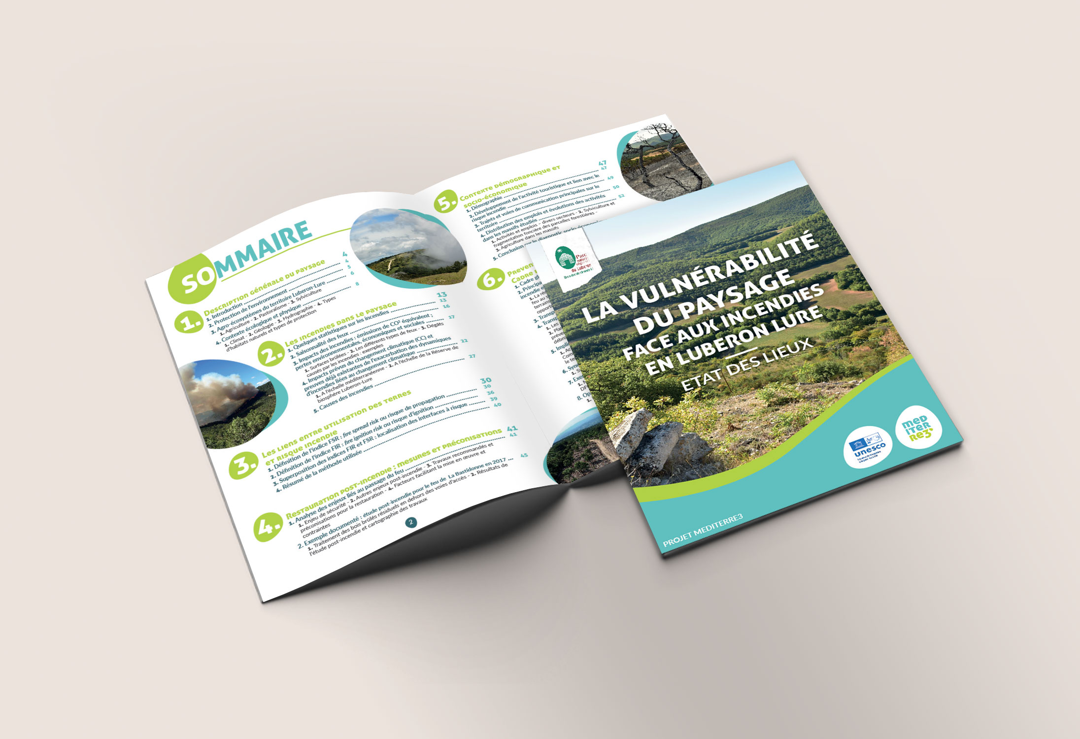 Mise en page des pages de couverture, sommaire et intercalaires du document "La vulnérabilité du paysage extensif face aux incendies en Luberon-Lure" pour le Parc Naturel régional du Luberon. 11 pages A4, 7 pictogrammes.