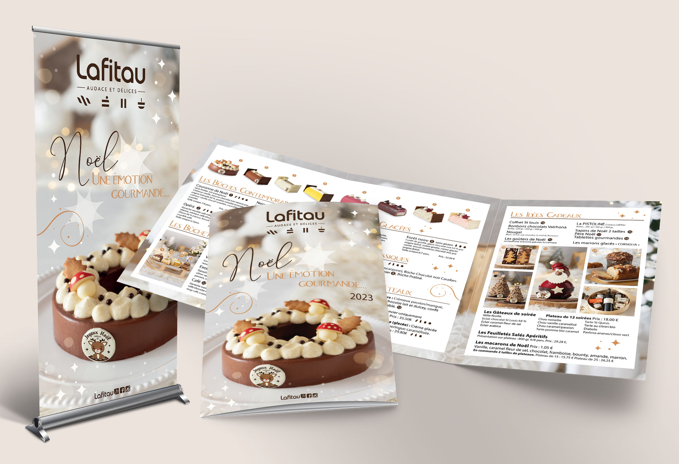 Carte de Noël pour les pâtisseries Lafitau déclinée en kakémonos, affiches, diapos et divers bannières pour le site internet et facebook.